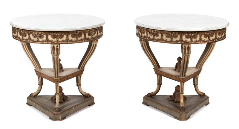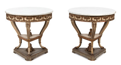 A Pair of Italian/Louis XV Style Marble Top Round Tables Height 29 x diameter 30 inches.