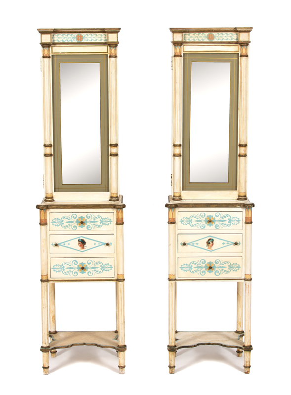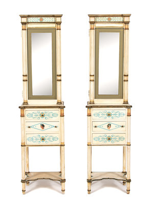 A Pair of Directoire Style Painted Cabinets Height 57 3/4 x width 14 3/4 x depth 10 inches.