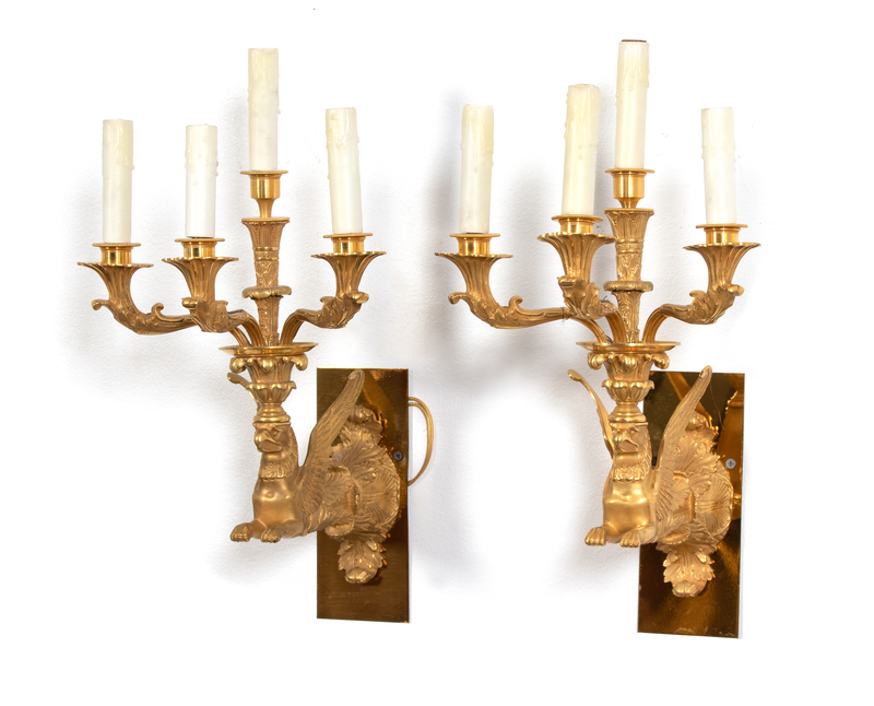 A Pair of Neo-Classical Gilt Bronze Griffon Form Three-Light Wall Sconces