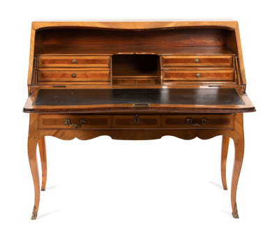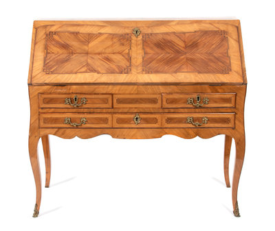 An Italian Rococo Style Olivewood and Parquetry Slant Front Desk Height 40 1/2 x width 44 1/2 x depth 20 inches.
