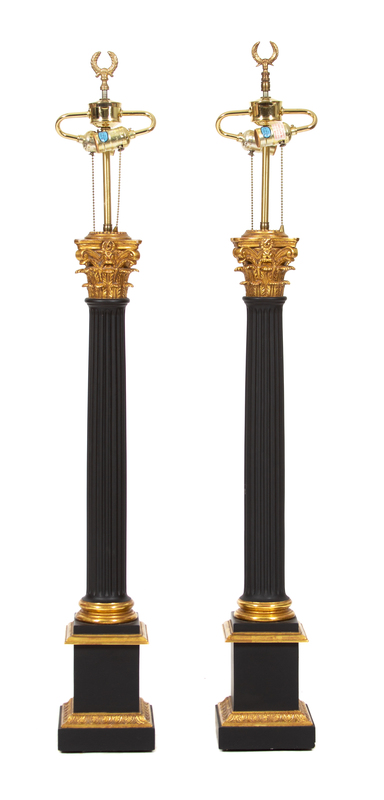 A Pair of Neoclasscial Style Ebonized and Gilt Metal Columnar Table Lamps Height 46 inches.