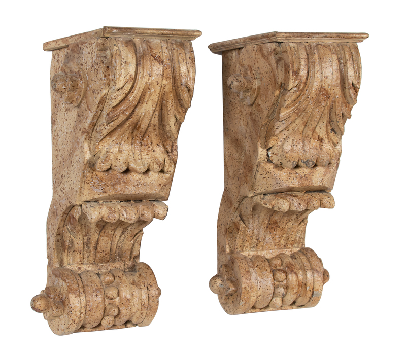 A Pair of Italian Carved Faux Marble Painted Wood Wall Mounts Height 28 x width 10 inches.