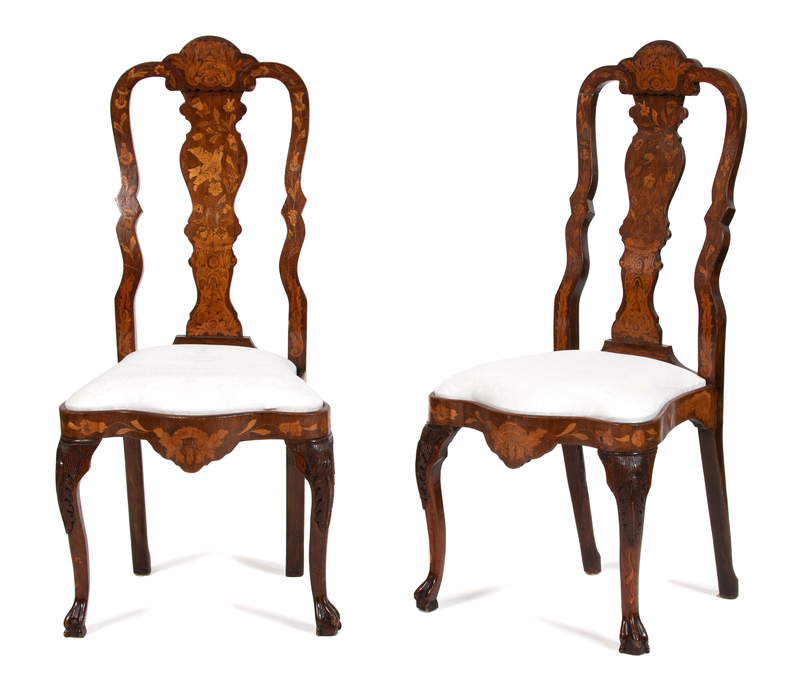 A Pair of Dutch Marquetry Inlaid Side Chairs Height 44 1/2 inches.