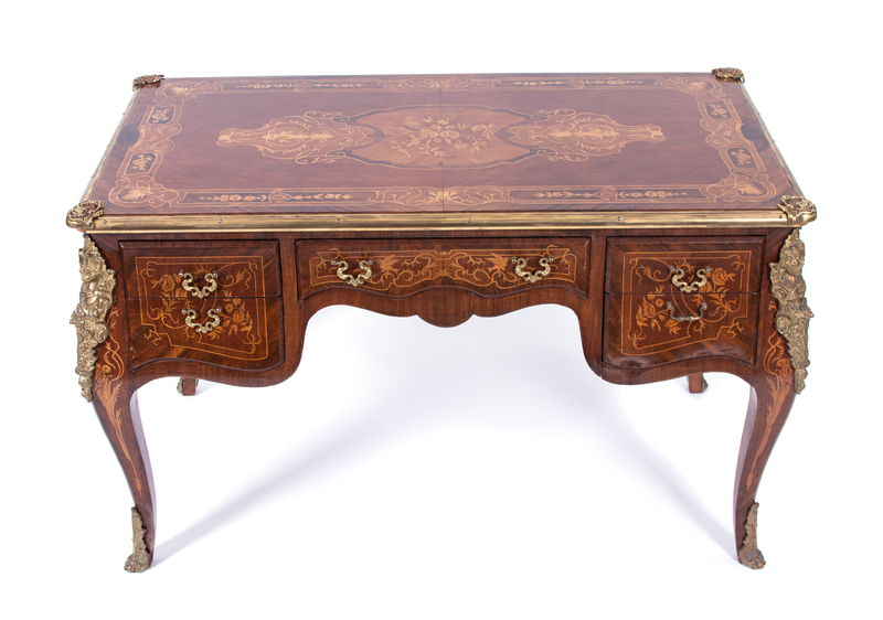 A Louis XV Style Gilt Bronze Mounted Marquetry Writing Table Height 32 1/2 x width 54 x depth 32 inches.