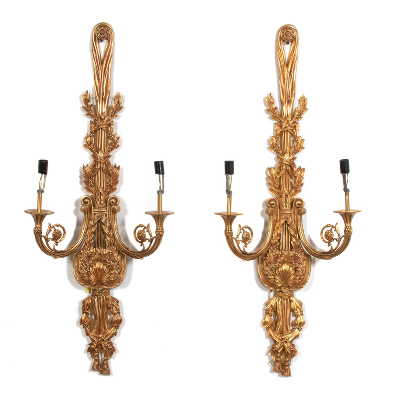 each with lyre-form back-plate with tasseled drapery and berrying swag decoration, electrified.