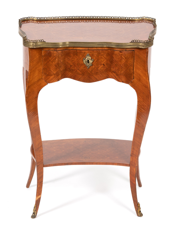 A Louis XV Style Parquetry Inlay Table en Chiffonniere Height 29 1/2 x width 22 x depth 14 inches.