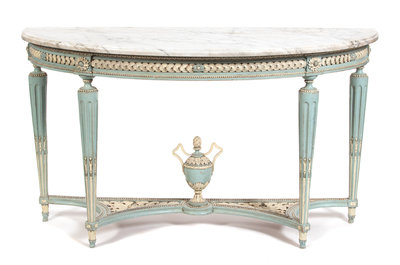A Louis XVI Style Carved and Painted Marble Top Console Table Height 34 x width 60 x depth 22 inches.