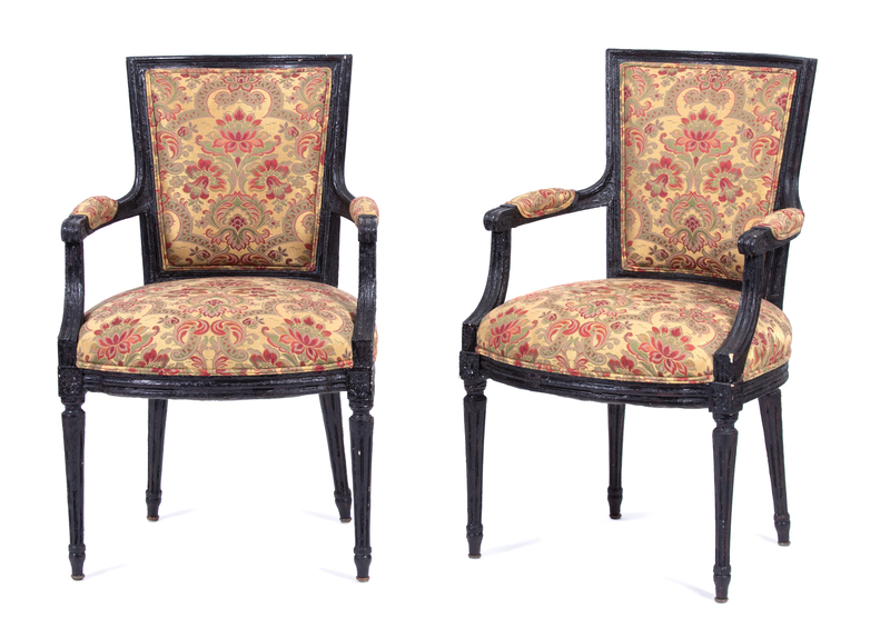 A Set of Six Louis XVI Style Black-Painted Fauteuils Height 37 1/2 inches.