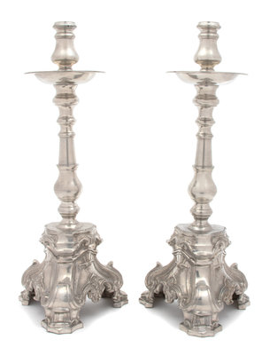 A Pair of English Silverplate Candlesticks Height 17 inches.