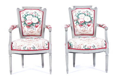 A Pair of Louis XVI Style Fauteuils Height 34 inches.