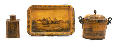 A Group of Three French Yellow Toleware Articles Length of tray 13 1/2 inches.