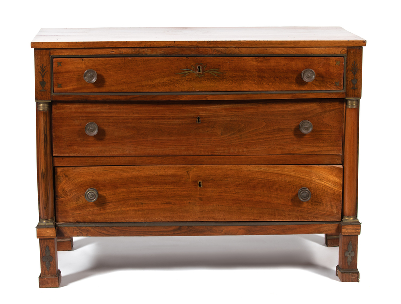 with the top drawer inlaid with brass flowers and leaves around the escutcheon, pilasters and feet inlaid with brass urn and floral forms.