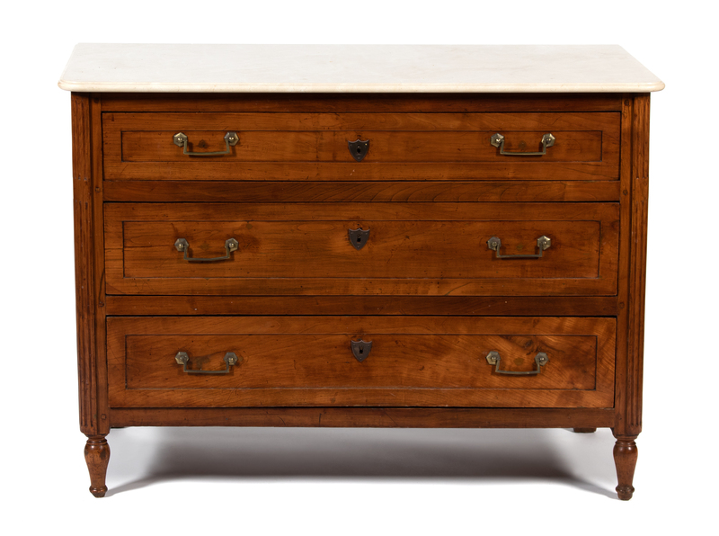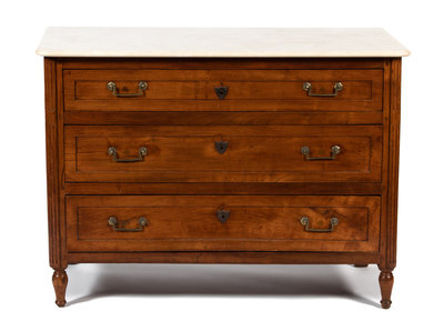 A Continental Provincial Style Carved Fruitwood Marble Top Commode Height 33 1/2 x width 46 3/4 x depth 21 3/4 inches.