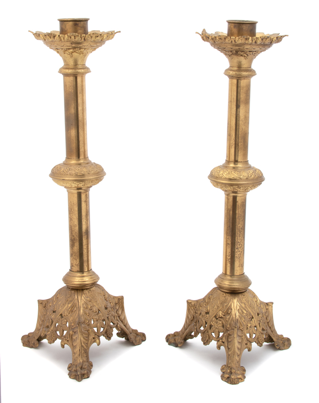 A Pair of Continental Molded Brass Torcheres Height 24 3/4 inches.