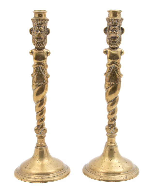 A Pair of Brass Figural Candlesticks Height 13 3/4 inches.