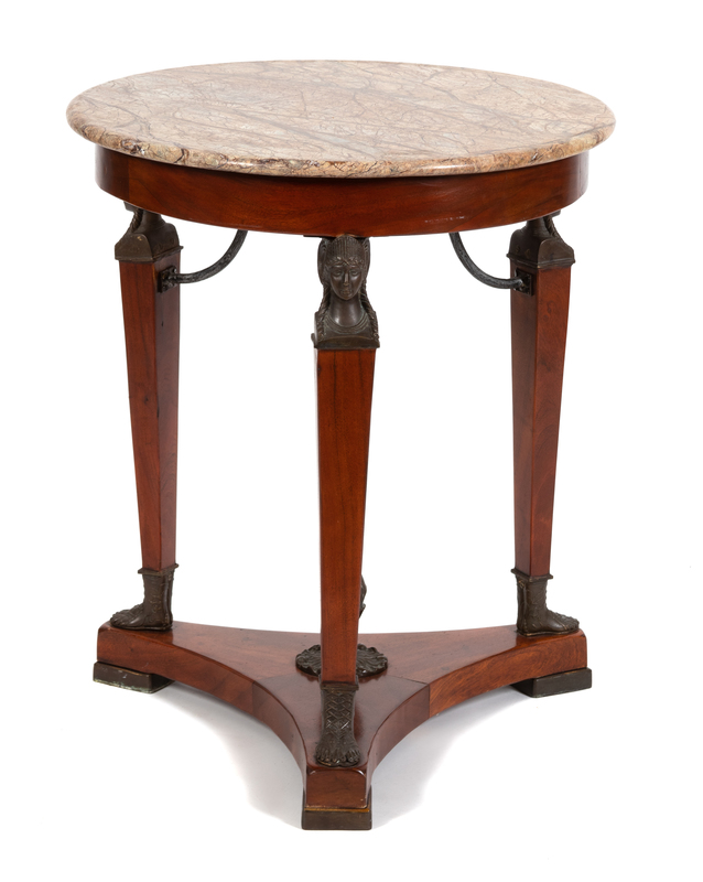 A French Empire Style Bronze Mounted and Marble Top Gueridon Height 28 1/2 x diameter 24 inches.