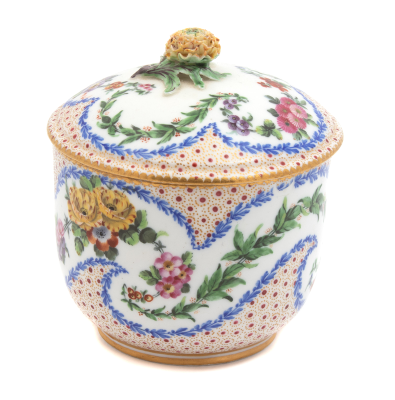 A Sevres Porcelain Sugar Bowl with Lid Height 4 inches.