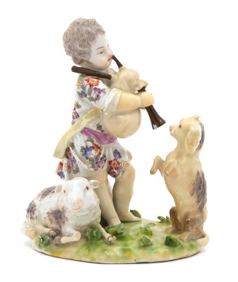 A Meissen Figure of a Putto with Bagpipes Watched by a Dog Height 5 1/2 inches.