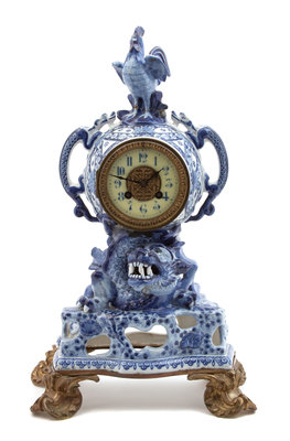 A Continental Blue and White Porcelain Clock Height overall 19 inches.