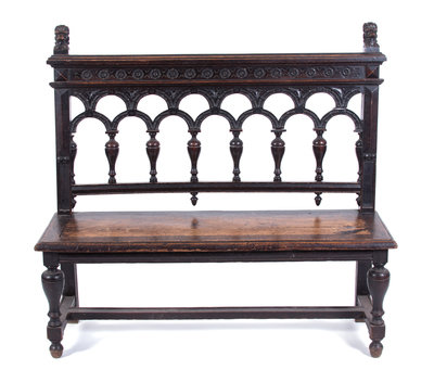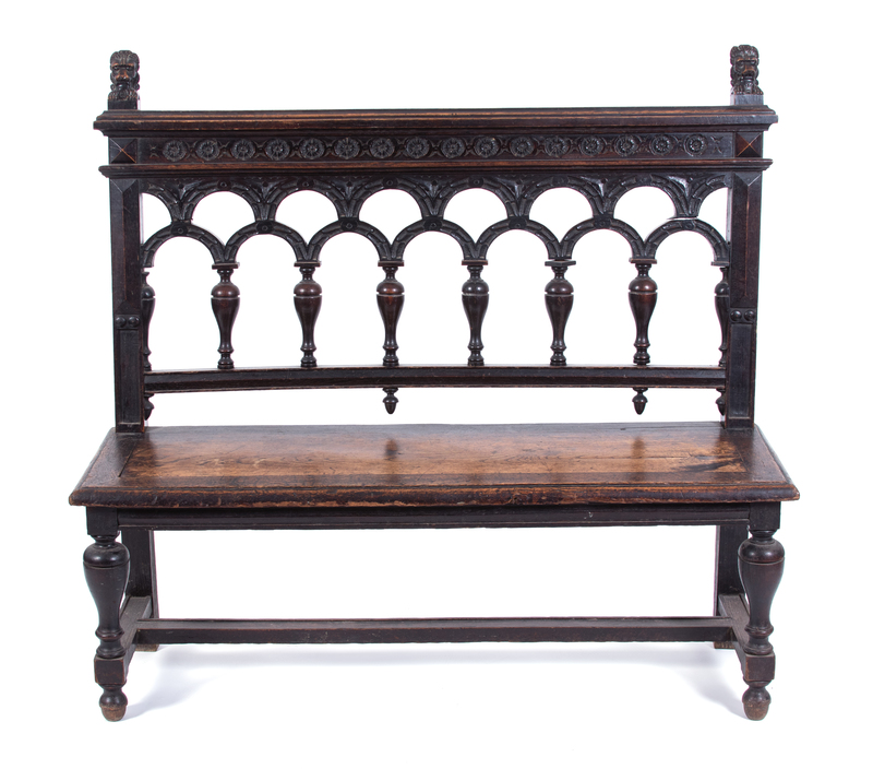 A Gothic Revival Style Bench Height 46 x width 50 x depth 15 inches.