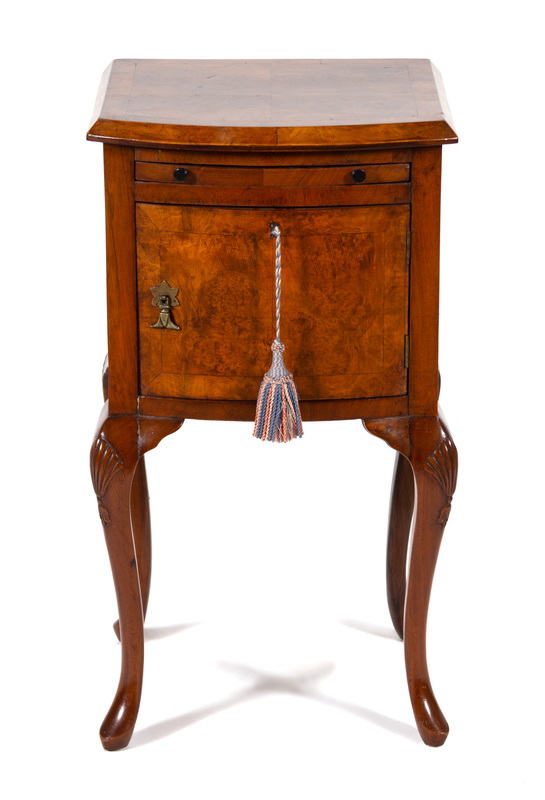 A George II Style Burl Walnut Bow Front Side Cabinet Height 30 x width 16 1/4 x depth 15 inches.
