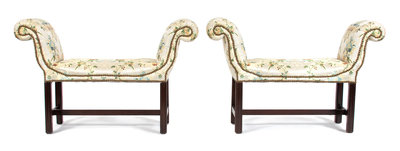 A Pair of George III Style Mahogany Scrolled Arm Window Benches Height 28 x width 44 x depth 14 inches.