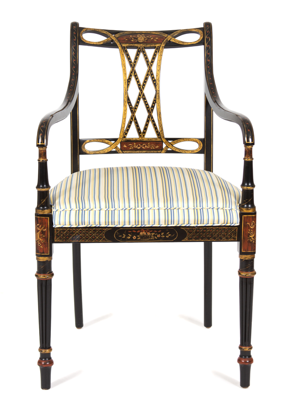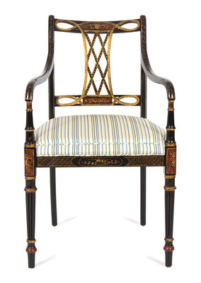 A Regency Style Ebonized and Gilt Decorated Open Armchair Height 37 inches.