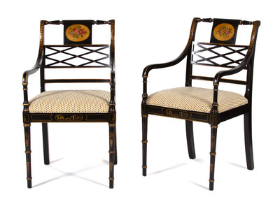 A Pair of Regency Style Ebonized and Parcel Gilt Open Armchairs Height 36 1/2 inches.