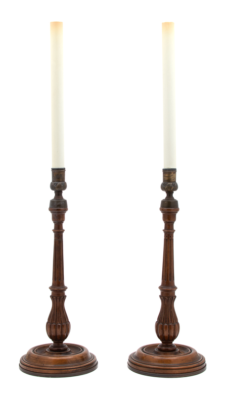 A Pair of English Walnut Columnar-Form Candlesticks Height overall 29 inches.
