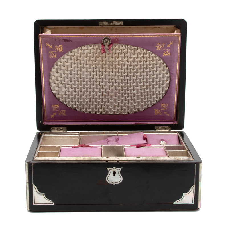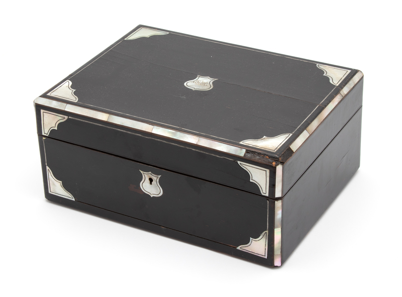 An English Black Lacquer and Mother-of-Pearl Inset Sewing Box Height 5 x width 11 3/4 x depth 9 inches.