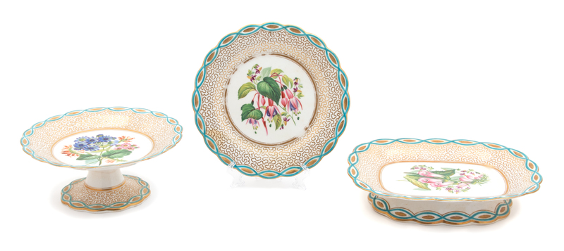comprising two round tazzas, two oval footed plates, and eight plates; with turquoise and gilt interlaced borders.