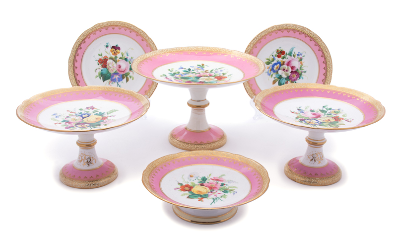 having pink and gilt borders center floral bouquet center decoration; comprising a large compote, a pair of smaller compotes, a pair of low compotes and twelve plates 17 items total.