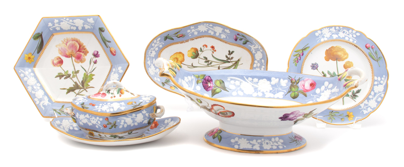 comprised of four hexagonal bowls, two oval shallow bowls, a large footed oval compote, a covered sauce boat with undertay, and eleven plates.