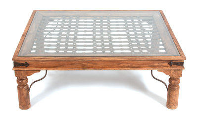 A Gothic Style Low Table Having Repurposed Inset Iron Gate Height 15 1/2 x width 35 1/2 x depth 35 1/2 inches.