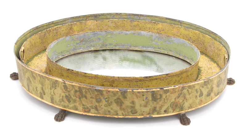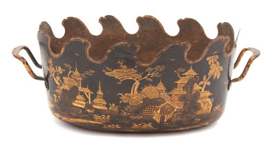 comprising an oval black chinoiserie decorated two-handled bowl with scalloped edge; and a oval green faux marble two-part centerpiece with mirrored interior and brass paw feet.