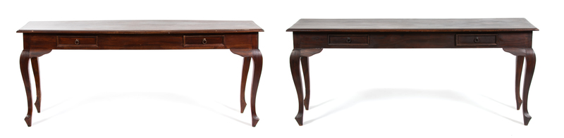 A Near Pair of French Provincial Style Console Tables Height 30 x width 70 1/2 x depth 19 1/2 inches.