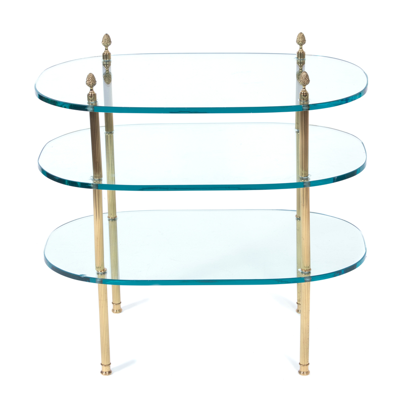 A Pair of Brass and Glass Triple Shelf Side Tables Height 26 inches.