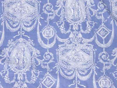 Two Curtain Panels of Blue and White Toile Fabric Each: Height 92 x width 80 inches.