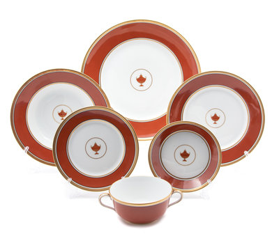 Imperio Red pattern with urn center; comprising;15 dinner plates17 salad plates15 bread and butter plates19 flat cups19 saucers,85 pieces total.