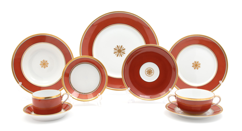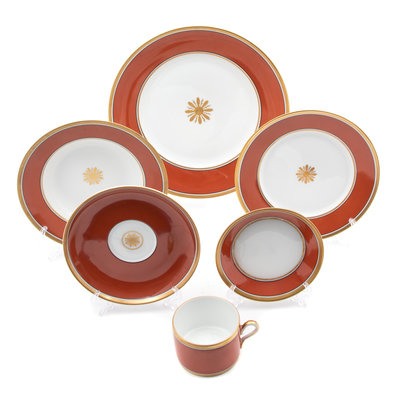 Visconti Red pattern, comprising;28 dinner plates14 salad plates8 rimmed soup bowlsfour bouillons with four undertrays16 flat cups 16 saucers,86 pieces total.