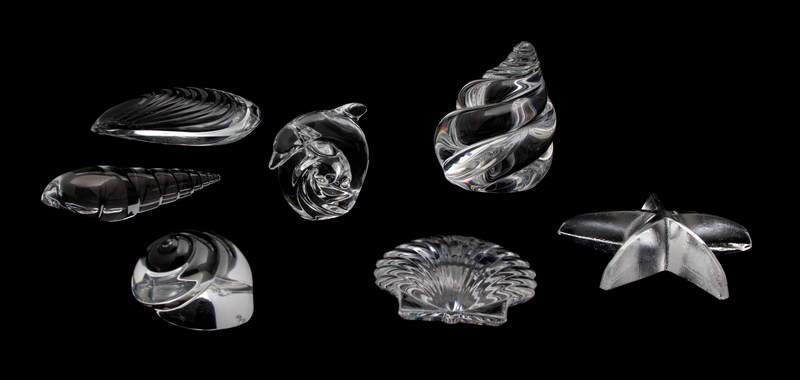 comprising Steuben paperweights and one Baccarat shell paperweight, 7 items total.