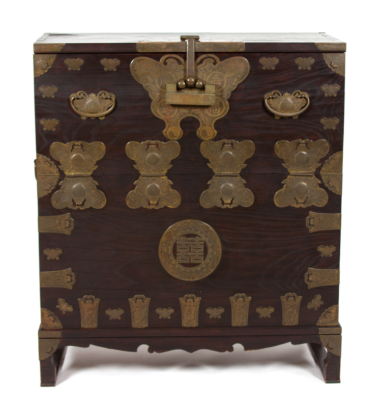 A Korean Brass Mounted Campaign Desk Height 49 x width 42 x depth 18 inches.
