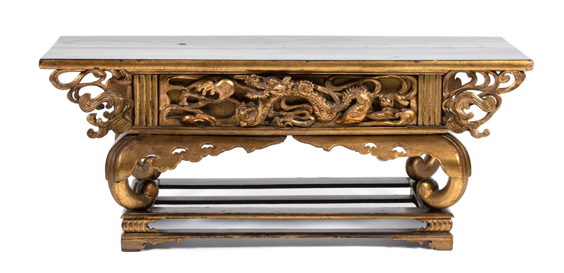 A Japanese Black and Gilt Lacquer Low Altar Table Height 17 x width 41 1/2 x depth 14 1/2 inches.