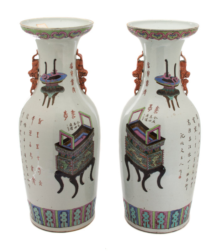 having applied foo-dog handles; decorated with various vessels and calligraphy.