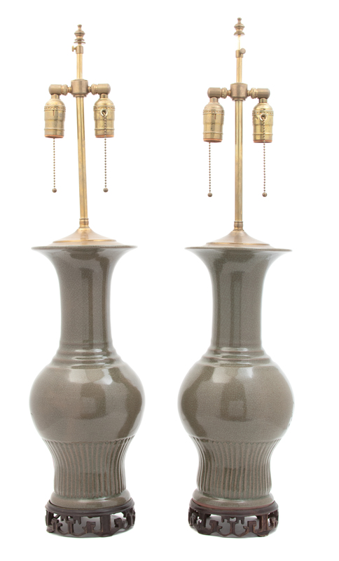 A Pair of Chinese Crackle Glazed Porcelain Vases Mounted as Lamps Height overall 33 1/2 inches.