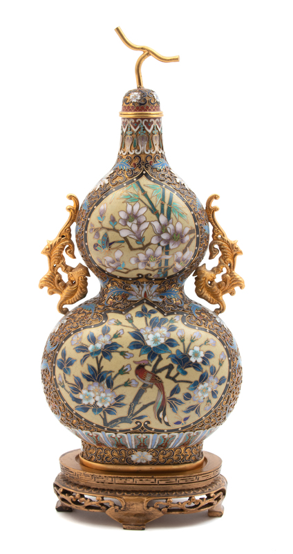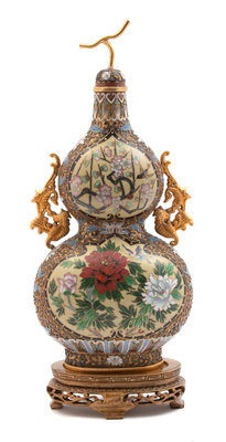 A Chinese Enameled and Cloisonne Gourd-form Lidded Vase Height 14 1/4 inches.