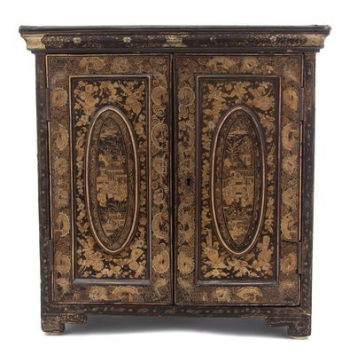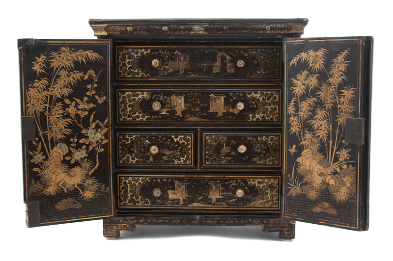 A Chinese Export Black and Gilt Lacquer Chinoiserie Decorated Specimen Cabinet Height 15 x width 14 1/2 x depth 8 1/2 inches.
