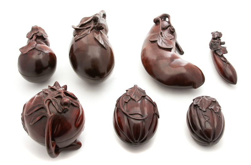 A Collection of Seven Japanese Carved Hardwood Vegetable-form Boxes Largest, Length 9 1/4 inches.