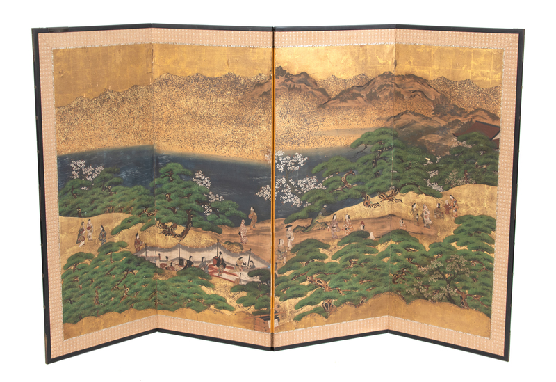 A Pair of Japanese Painted and Gilded Four-Fold Screens Each screen height 47 1/2 ; width 80 inches.