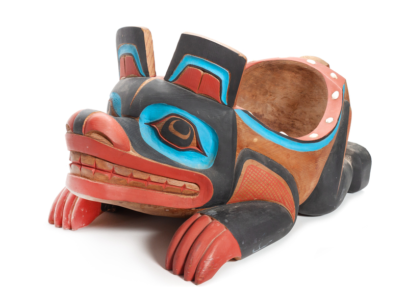 polychrome carved wood bowl, depicting a bear, signed Lelooska (base)